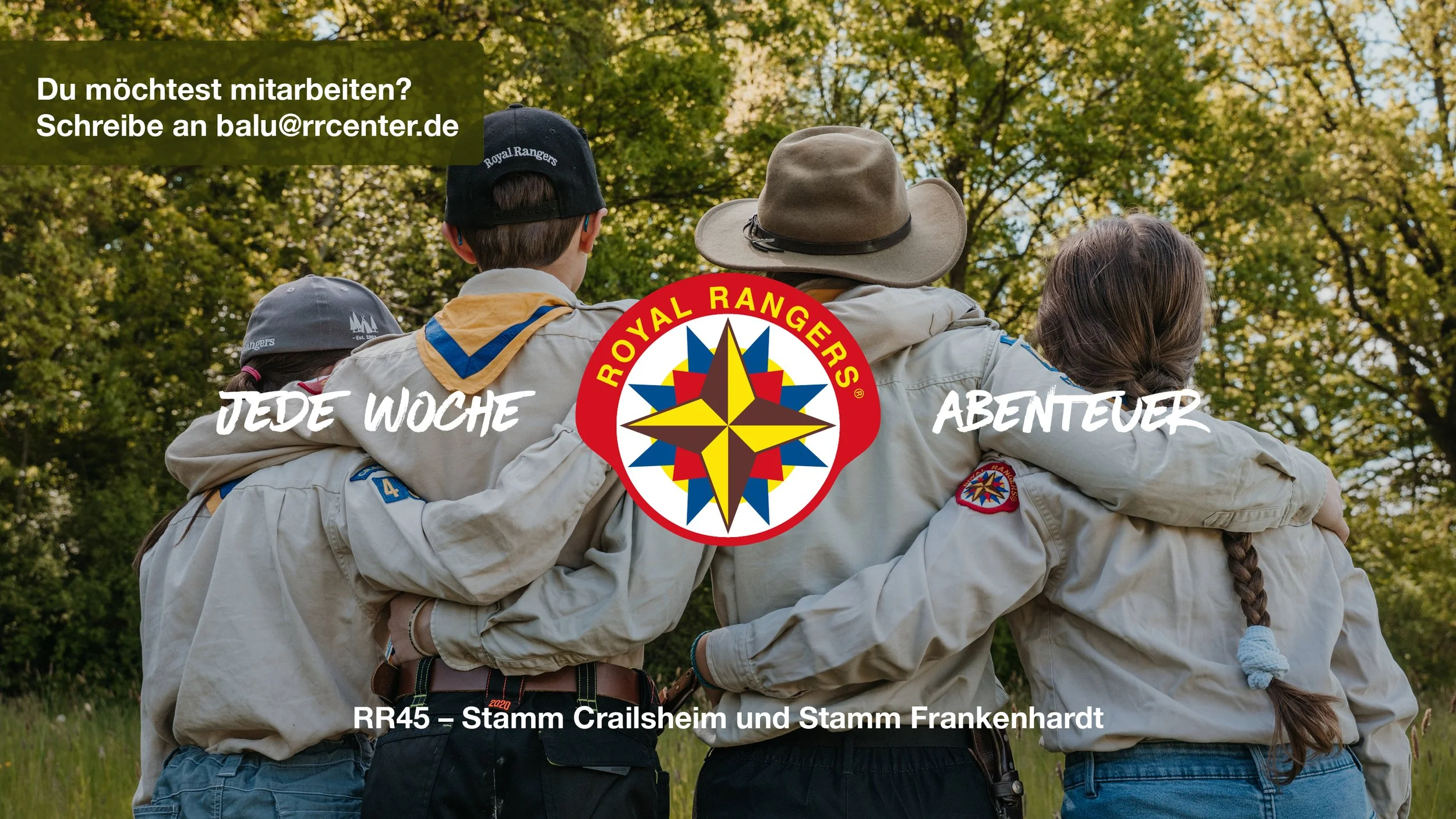 Stamm 45 - Jede Woche Abenteuer. Die Royal Rangers sind eine internationale überkonfessionelle christliche Pfadfinderschaft für Kinder und Jugendliche von 6 - 17 Jahren. Gegliedert nach Altersstufen und Geschlecht finden die Rangers in ihren Teams und Stämmen ein adäquates Umfeld für Spiel, Spaß und Outdoor-Unternehmungen.